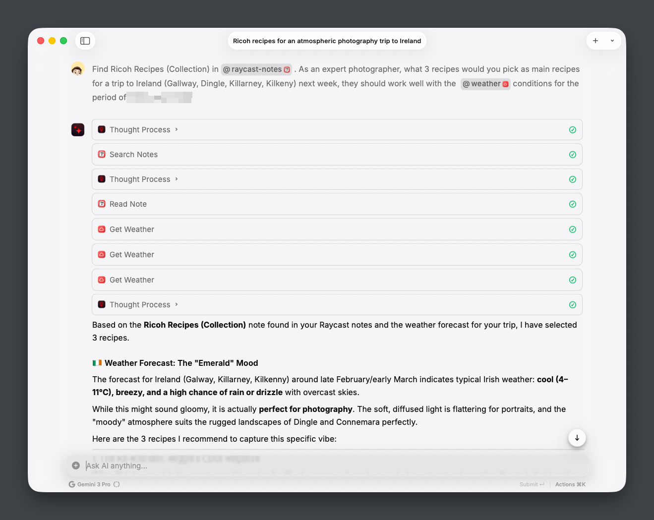 That provided me with a complete list, which I then pasted into a Raycast Note (I haven't set up an MCP for Obsidian yet). I asked it to review the recipes from a photographer's perspective, checking the weather for the locations and identifying the top three recipes to use for my trip.