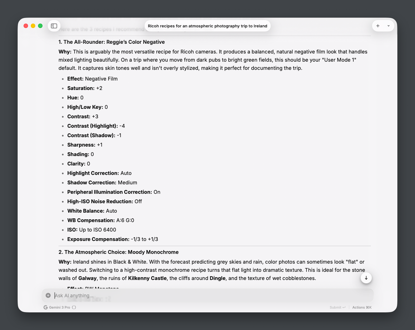 Since an LLM cannot easily extract data from an iOS app like the Ricoh Recipes one, I instead used the links from ricohrecipes.com and provided them to a single chat, asking it to extract only the settings for the recipes using Raycast.