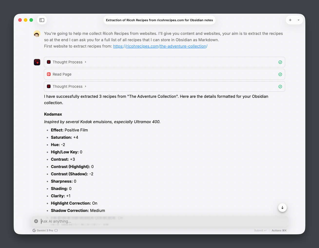 Manually this would require a lot of work: checking recipes on ricohrecipes.com and watching/pausing Reggie's video to apply the settings. So, I wondered, can't I use AI to help with this?