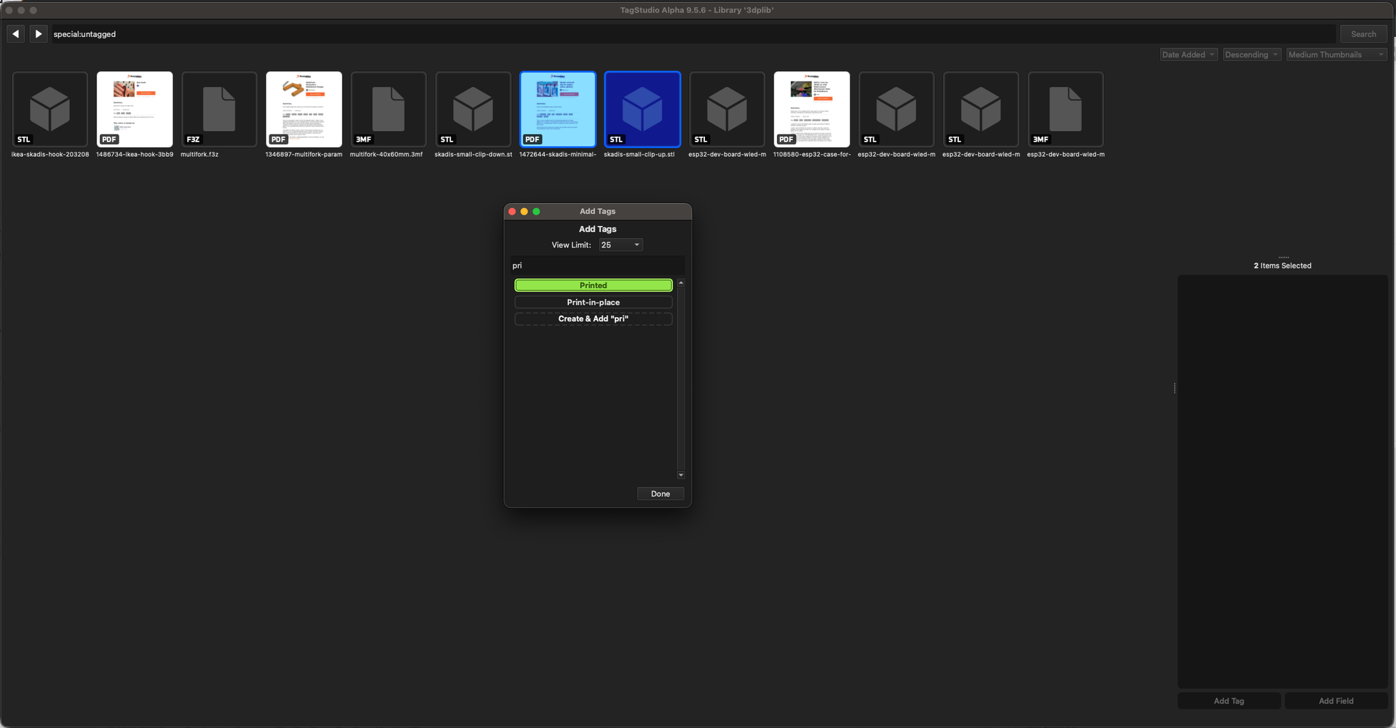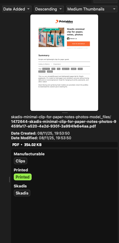 So I jumped once again and downloaded TagStudio, adding a new folder for 3D print files and started tagging them. I primarily download from Printables and here's how I do it today still: