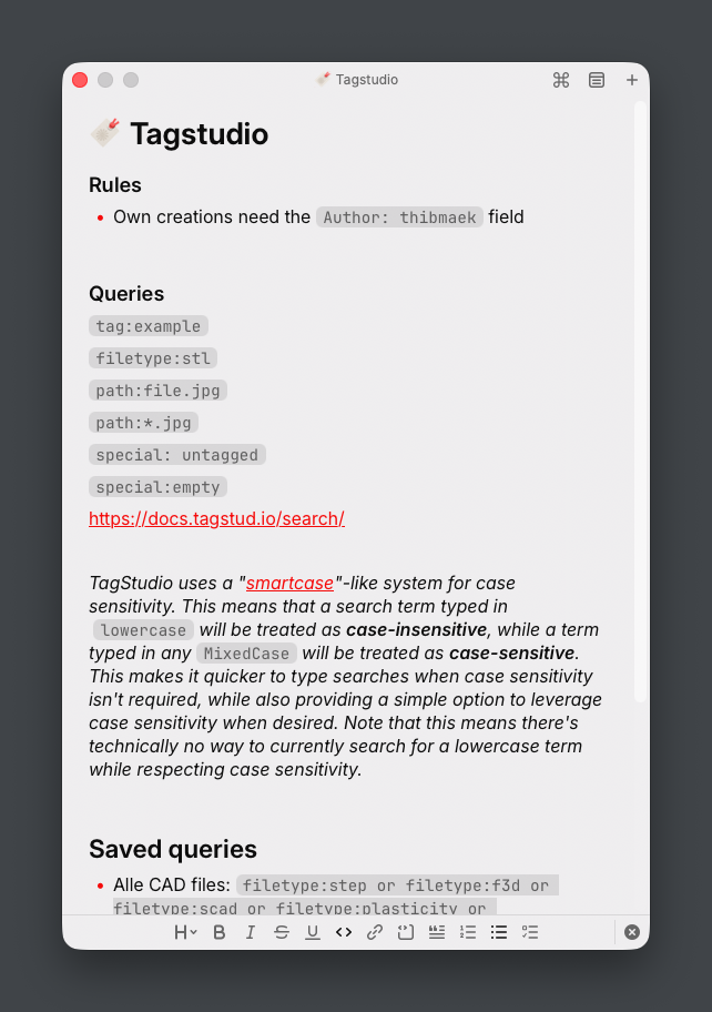 Queries that I often use like listing all PDFs, finding all untagged entries in the folder or finding my favorite Gridfinity prints are then all summarized in a Raycast note so I have it nearby any time: